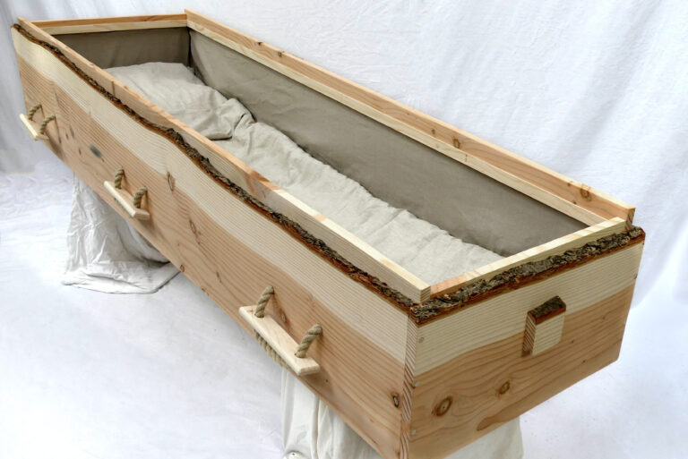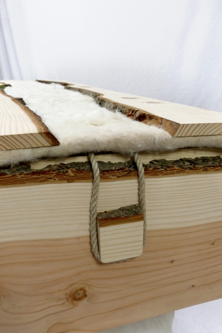 Onze standaard Baarnsche Kist is een puur en stijlvol afscheid zonder poespas. De kist is gemaakt van grenen, uit een tuin aan de Da Costalaan in Baarn. De deksel heeft een natuurlijk gevormde rand en is bekleed met handgevilte wol van schapen uit het Eemdal. Bekleding is gemaakt van ecologisch linnen.